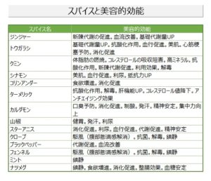 利尿効果のあるスパイスや血糖を安定させるスパイス、抗酸化作用やアンチエイジング効果があるものも見受けられます。