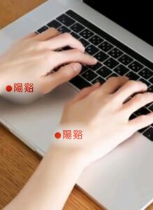 手の甲側、手首の間接、親指の付け根の窪みにツボがあります。