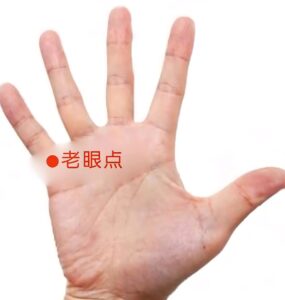 手のひら側の小指の付け根にある横ジワの真ん中にあるツボです。「老眼」の症状緩和や見え辛さ解消に効果を示します。