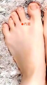 足の甲側、第二趾と第三趾の間の付け根のところがツボです。