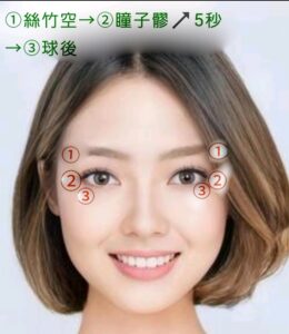①絲竹空(しちくくう)→②瞳子髎(どうしりょう)↗️5秒→③球後(きゅうご)のようにゆっくり優しく押さえると良いそうです。