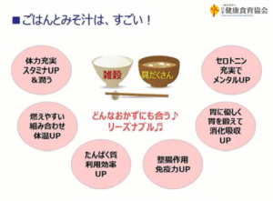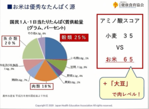 お米は炭水化物ばかりではなく、立派なたんぱく源にもなるとたんぱく質の多さも説明してます。アミノ酸スコアが65ですが、味噌などの大豆と合わせると肉に匹敵するアミノ酸スコア100を全うすると、ご飯とみそ汁の組み合わせを推奨しています。