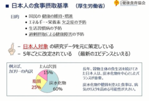 厚労省の5年ごとに改定される日本人の食事摂取基準は最新のエビデンスを基に発表されていますが、カロリーの内訳で言うと炭水化物60㌫、脂質25㌫、たんぱく質15㌫が望ましいとし、このバランスを崩すと生活習慣病を生みやすいと公表しています。