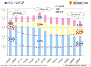 戦後は80㌫が炭水化物でしたが、その後は現代に至るまで減り続けていることを憂慮すべき事態であると指摘しています。