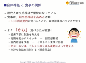 良く噛むことで、視床下部に刺激を与え、胃腸を動かす信号となり、副交感神経が優位になり、腸内環境を整え、セロトニン生成に奏功すると説明しています。