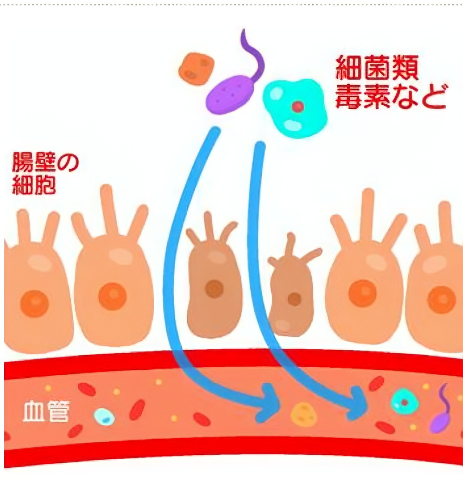 ※※…リーキーガット(leaky gut=漏れやすい腸)とは?腸の内表面、一重の細胞の層で覆われています。細胞と細胞は互いに密着し、さらにタイトジャンクションとよばれる装置で隙間をシールしています。健康な人ではこのシールが正常に働き、腸の内容物が漏れ出すのを防ぐバリアの役割を果たしています。しかしシールがうまく働かないと、細胞と細胞の間にわずかな隙間が開いてしまい、腸の内容物が漏れ出します。これがリーキーガットといわれる状態です。腸の内容物には、未消化の食物・腸内細菌・腸内細菌が産生した様々な化学物質・毒素などが含まれているので、これらが腸外に漏れ出すと健康に重大な影響を及ぼします。