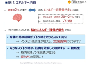 能の重さは全体重の2㌫ほどだが、全エネルギー消費の2割も消費していて、主にエネルギー源はブドウ糖であると元祖と同じことを語っています。
