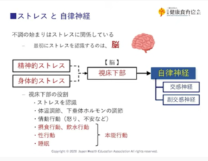 脳の視床下部が司令塔で様々なストレスに対応していて、自律神経を制御しているところで、ストレスを最初に認識するところでもあると。