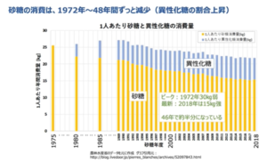 砂糖の摂り過ぎは確かに、様々な弊害もありますが、適度に摂る分については長く空く食間にすぐエネルギー化するエネルギー源として有効ですし、砂糖の消費が減っている現状からすると、砂糖によるトラブルやデメリットも減っているはずだと柏原氏。