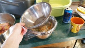 ⑥5分間めんつゆと混ぜてあった粉砕野菜をザルにあけ、上からラップをしてボールなどで押して絞ります(↓写真参照)。