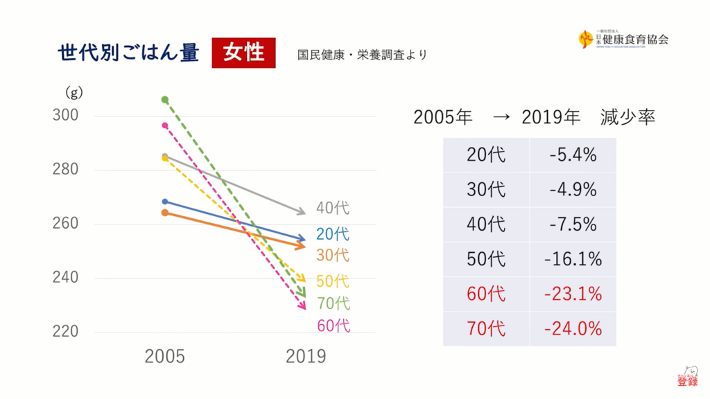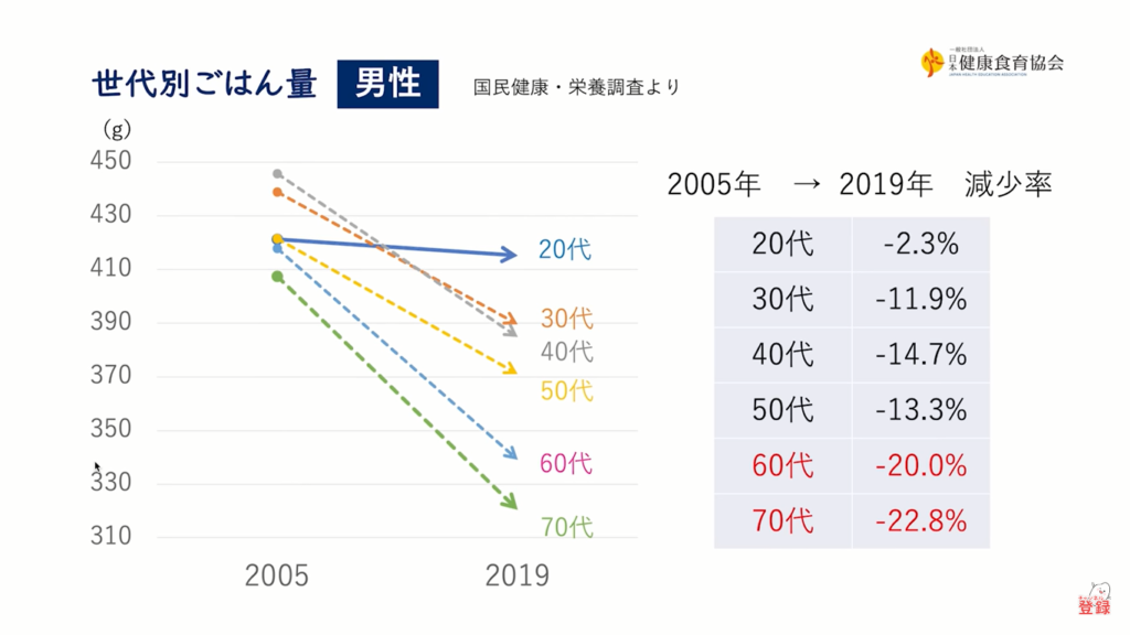 女性の場合は非常に興味深く、2005年には高齢女性の方が若い女性よりご飯を沢山食べていましたが現在に向けての減少傾向が顕著です。一方20~40代の女性は現在に向けてご飯の摂取量の減少傾向は穏やかで、現在に向けて年配者より多くのご飯を食べています。