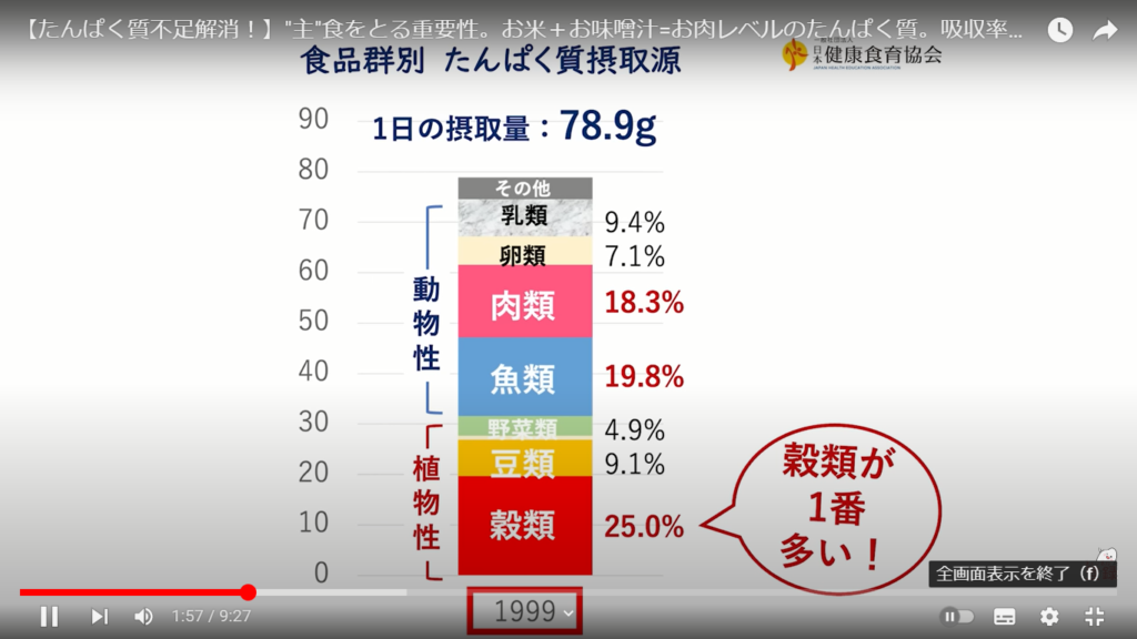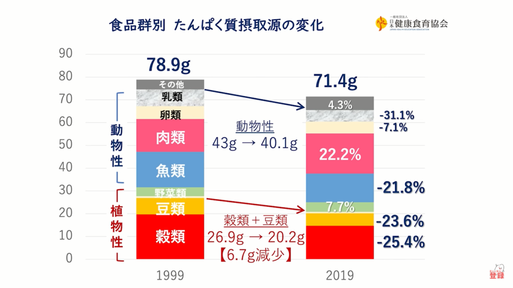 蛋白源の変遷を確認すると穀類(主食)と豆類の摂取減少が現代人の蛋白質不足の原因だとデータが物語っているという。