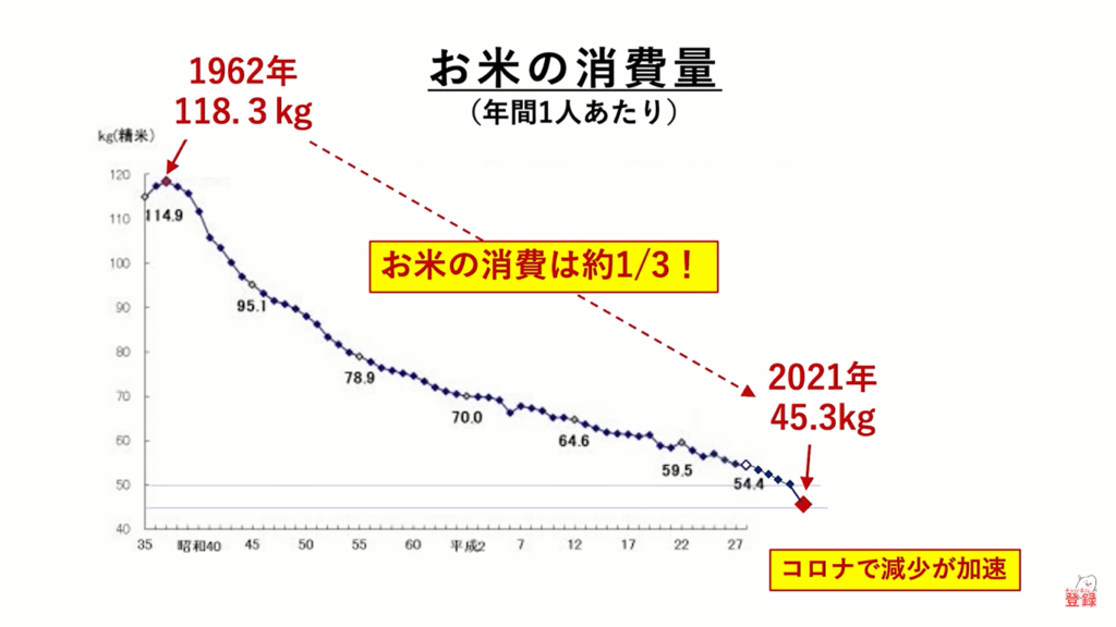 1962年から現在までお米の消費量は年々減少しているが、蛋白質の摂取量は1970年くらいまでは増えているという。この背景にはもともとおかずを沢山食べていなかった日本人が戦後の高度成長期を迎え豊かになったことで、おかずの摂取量が増え、お米+おかずの蛋白質の摂取で総じて上がっていたことが原因だとしています。