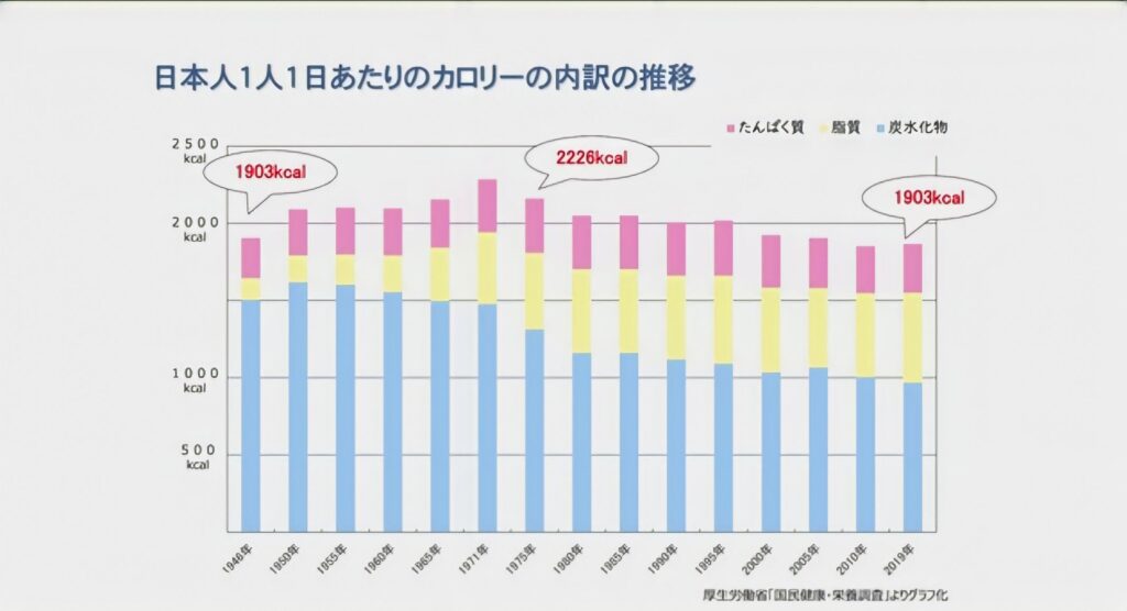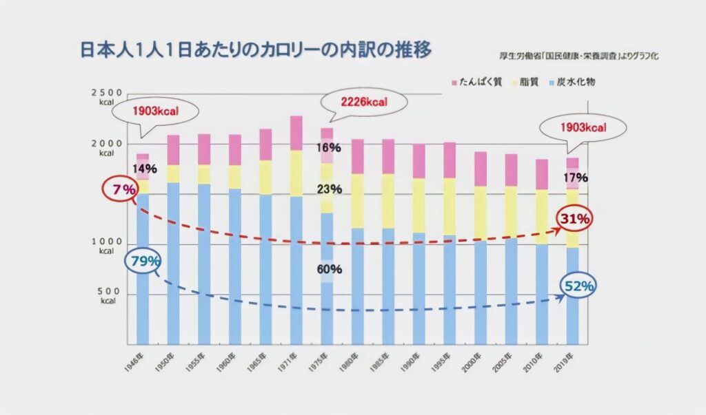 日本人が最も病気になりにくい、太りにくい、そして健康で長生きできるというバランスとして一つの目安とされているのが1975年前後の栄養バランスといわれているようです。