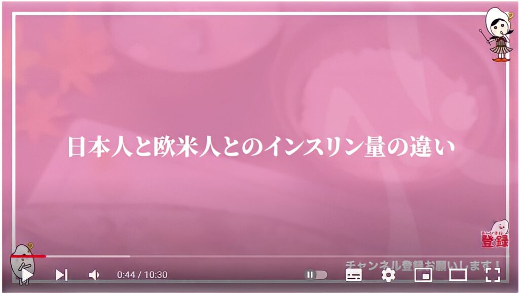 「もともと日本人はインスリンが少ない・遅いタイプが多い。西洋人のようにインスリンが効きすぎて糖尿病にならない代わりに極度の肥満になるのと異なり、日本人は極度の肥満が少ない代わりに糖尿病多い。もともとの体質と対症療法、どちらも考慮すべき」