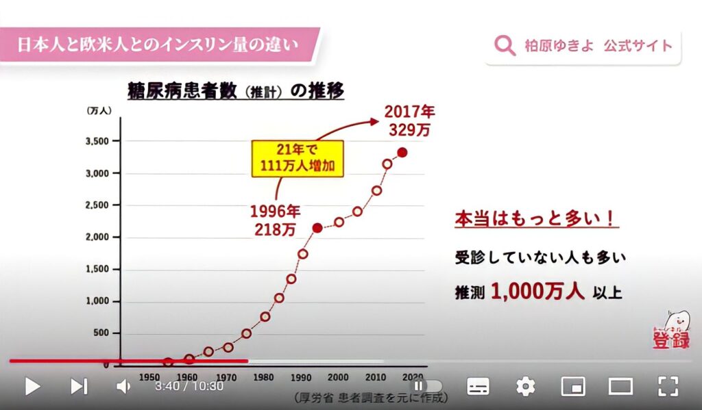 柏原先生は、このコメントについては異論はないものの、もともと糖尿病が少なかった日本人が近年罹患率が増えている原因について次のように語っていました。