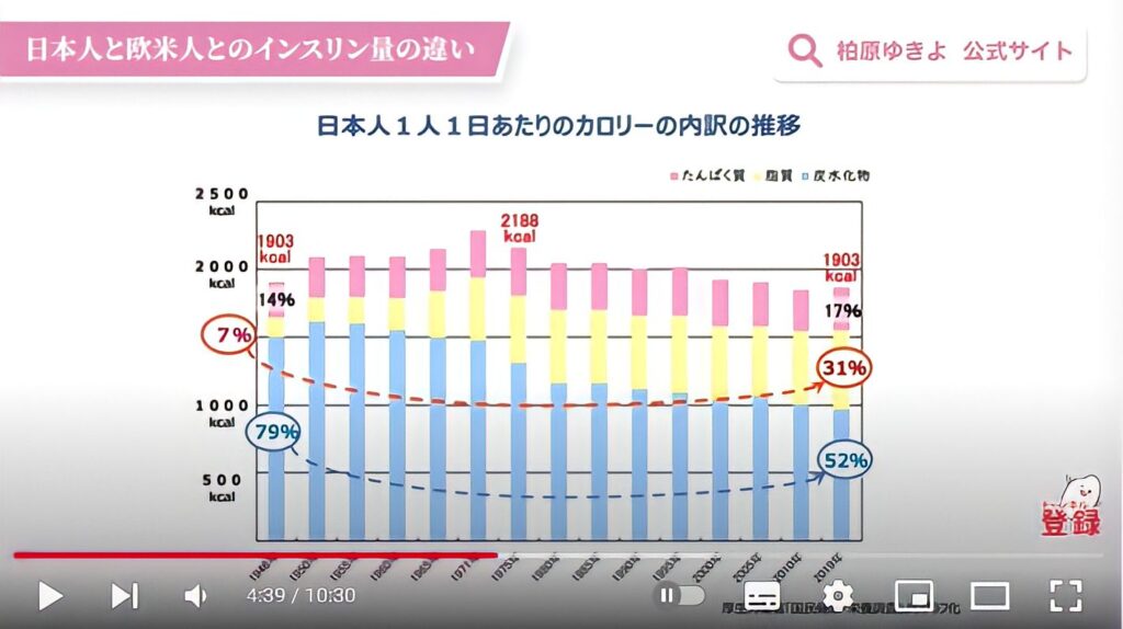 「戦後すぐの時は日本人のエネルギー摂取量の8割がお米による炭水化物。それが近年に掛けて5割にまで減少しているのです。一方、炭水化物が減った分、増えているのが脂質であり、この脂質がインスリンの効きが悪い状況を作ってしまうのです。ご飯を減らし、糖質を控えるほどかえって脂質の比率は、上がってしまうのです。油を控えた食事をしているつもりでもトータルで比率が上がってしまうということになり、単に糖質を控えるだけではうまくいかないという事なのです。」