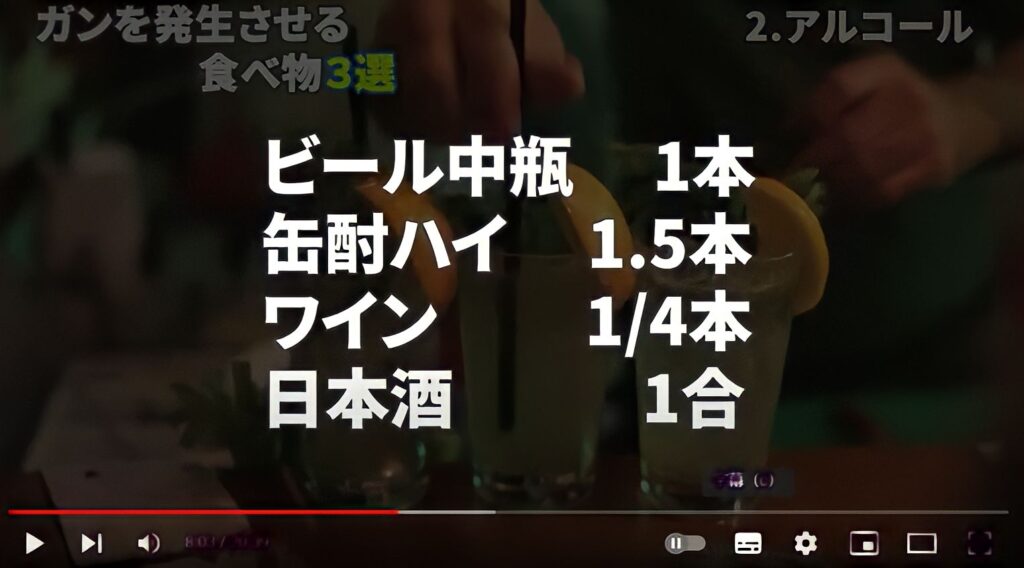 ガンにならないための一日あたりの飲酒の量としてはビール中瓶1本、缶酎ハイ1.5本、ワイン1/4本、日本酒1合を目安にすることを推奨しています。