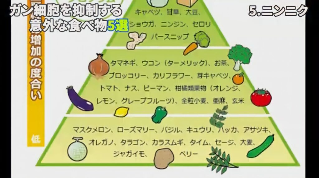 アメリカのがん国立研究所が作成したデザイナーフーズピラミッドには免疫学研究に基づいてがん予防に効果のある植物性食品がまとめられています。そのデザイナーフーズピラミッドの頂点に君臨するのがニンニクなのです。