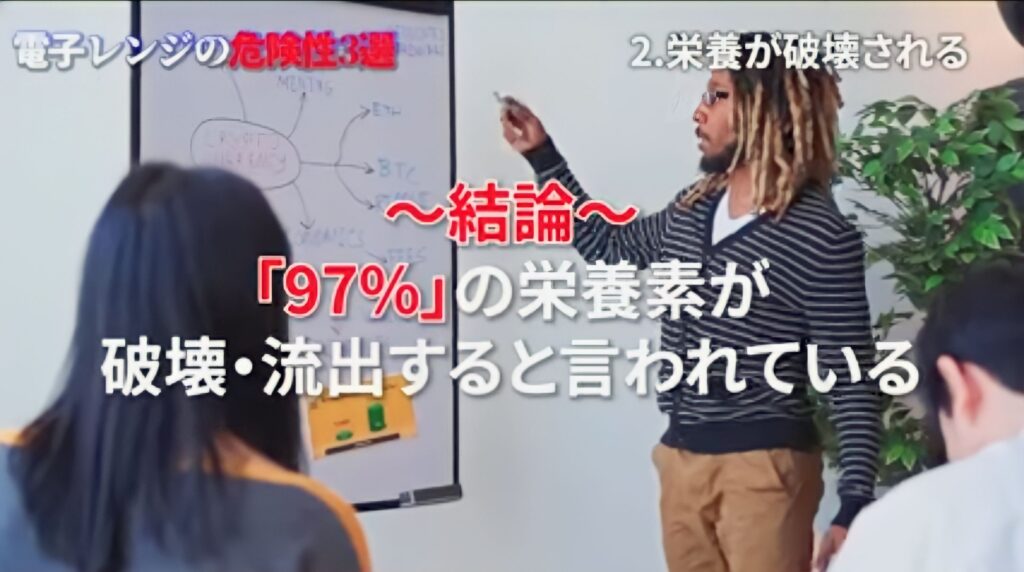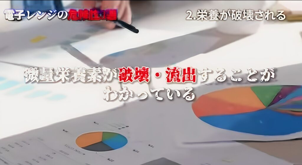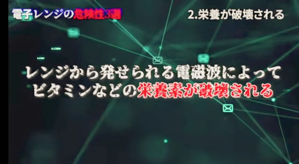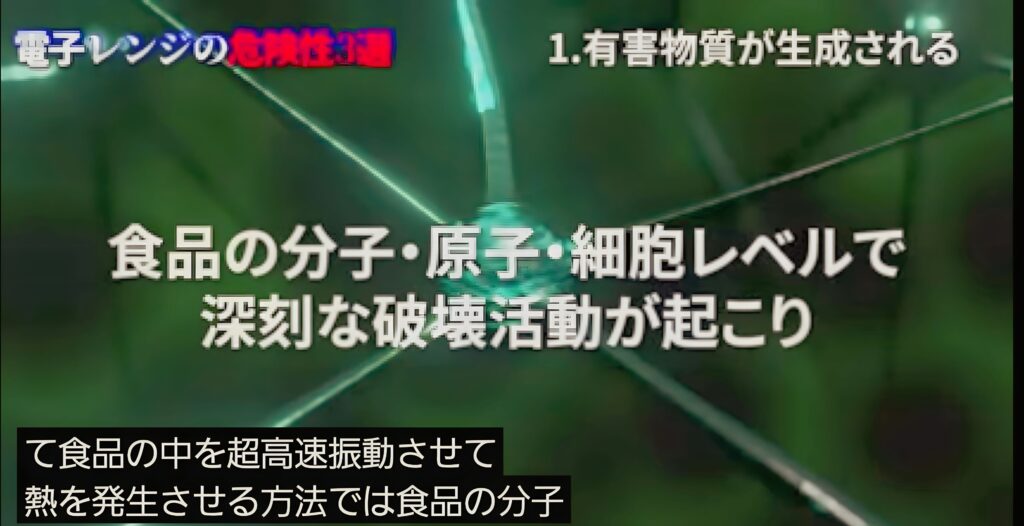 その理由として電磁波を食品に当てて食品の中を超高速で回転させて熱を発生させる方法では食品の分子・分子・細胞レベルで深刻な破壊活動が起こり、人間の体内で代謝できない成分が発生してしまうというのです。