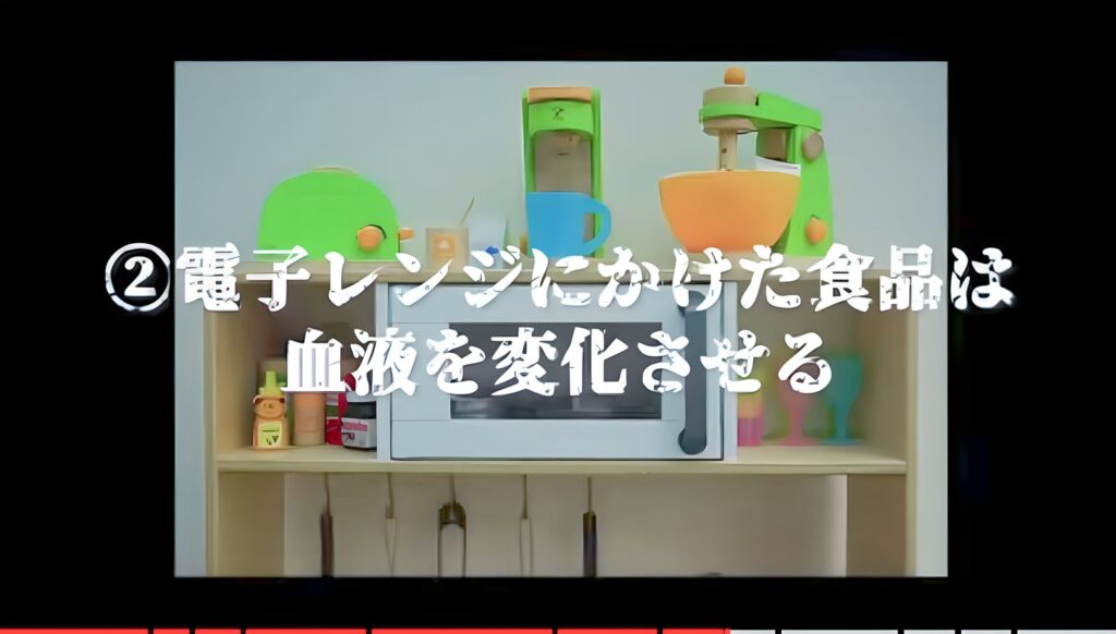 ハウスハーセル氏の見解によると電子レンジで加熱調理された食品の成分は異様に変質し人の血液に悪影響をもたらすとの見解を述べていました。