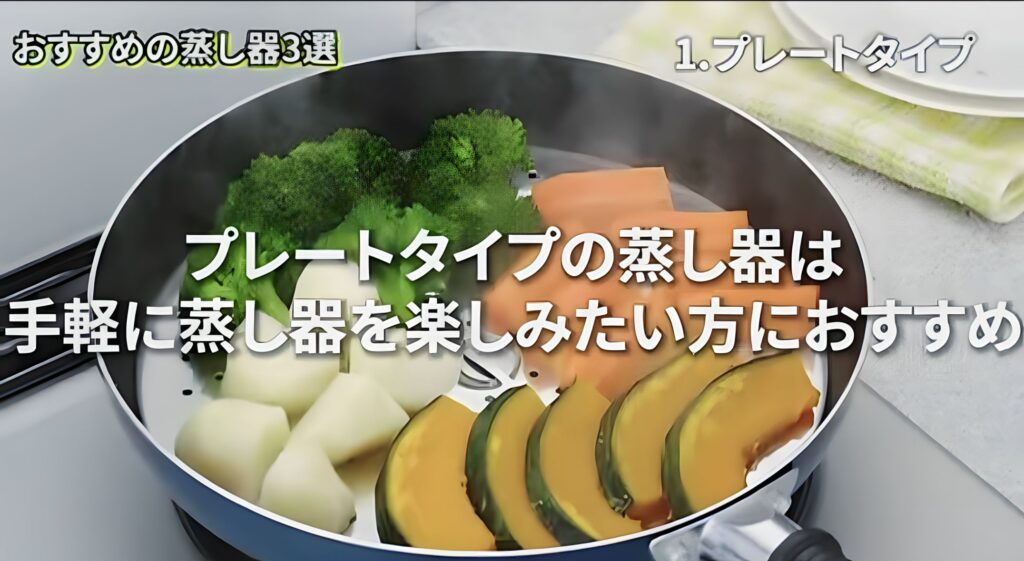 手持ちのフライパンなどに水とプレートタイプの蒸し器を強いて蓋をして日にかけるだけで家庭で感嘆に蒸し器を試用することが出来ます。
