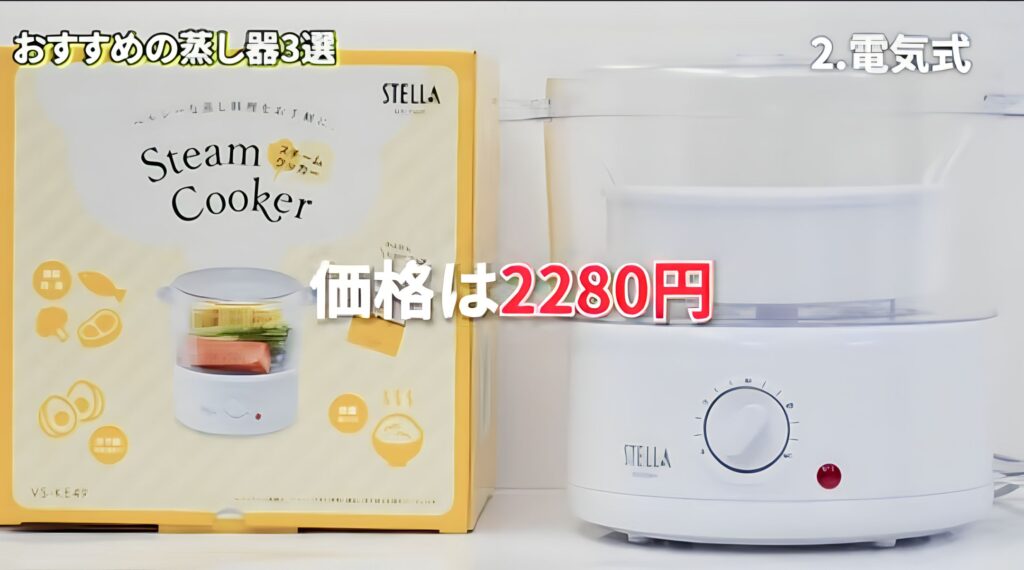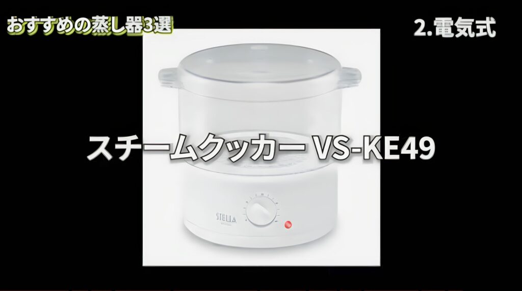 お勧めの電気式蒸し器はスチームクッカーVS-KE49で2,280円と廉価で電気式蒸し器の中では求めやすいものとなっています。