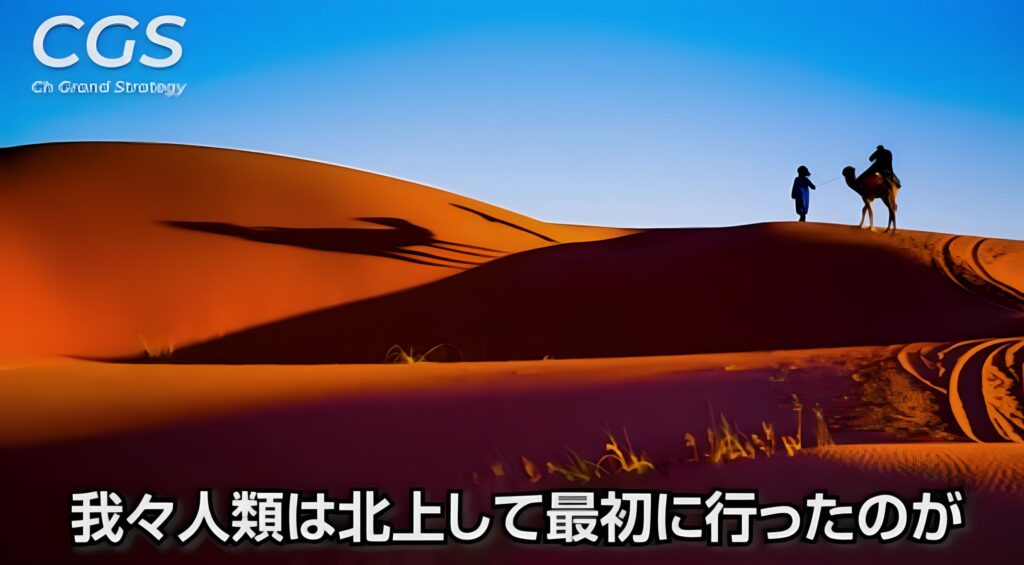 それでアフリカ大陸から砂漠が始まり、植物がなくなると人類は北上して最初に行ったのが、アラビア半島です。そこで同じようなことをして植物がなくなり、乾燥した気候になって、乾燥した気候でも栽培できる栽培できる小麦やオリーブ、ブドウなどを育てるようになったのです。