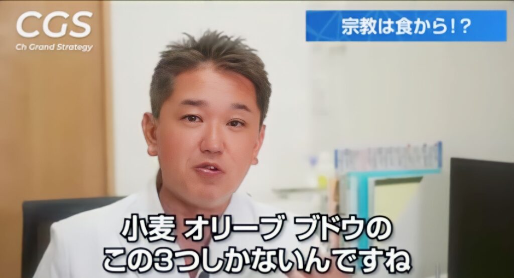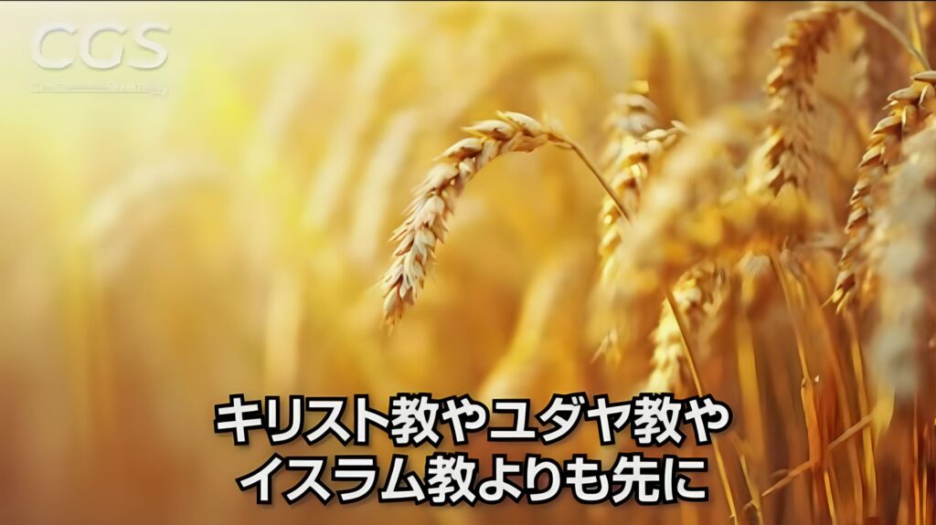 インド人はインドの方に行きました。そうするとある人種が食べる作物が育ち、その作物ができる文化が生まれる。つまり、まず土地とか気候が先で、次に栽培が起こり、そこで食べることができ、病気に適応するようになる。そうすると文化ができ、文化から宗教が生まれるのでキリスト教やユダヤ教やイスラム教よりも先に小麦というものがあって、その文化があって宗教ができていったのです。