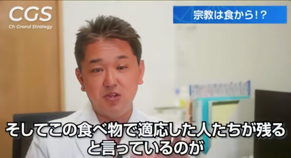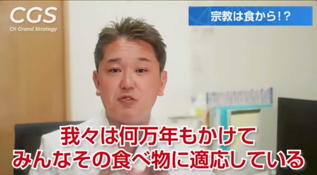 そして神道だとかインドのヒンズー教とかイスラム教とかキリスト教とかいうのはそれぞれ宗派があるのではなくて、何を食べていたとか、どんな気候だったのか、それによって文化ができて、宗教ができているわけなので、それぞれ食べ物が違い、人類は何万年もかけてそれぞれの食べ物に適応しているのです。