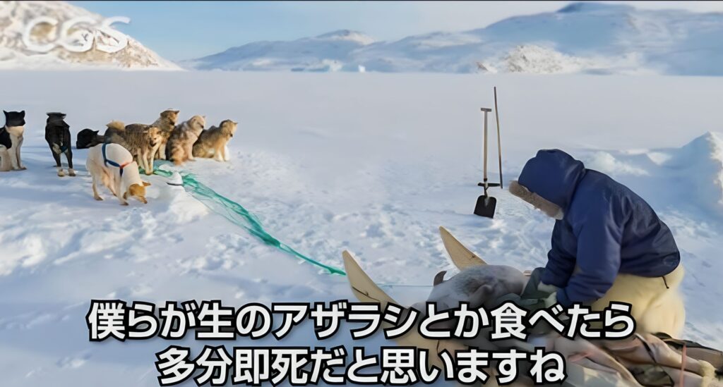 そもそも動物が可哀想な話があり、日本人が見たら心が痛みますが、エスキモーの人たちは子供のアザラシが来たら、頭を叩いて殺します。皮を剥いて、その中から油をスプーンで掬って舐めたりしながら獣肉を食べていくのです。