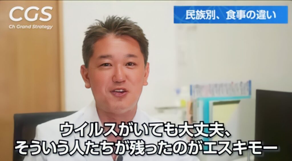 なぜエスキモーは大丈夫なのかというとそれに耐え得る遺伝子を持っている人たちだからなのです。生肉を食べても大丈夫、寄生虫がいても大丈夫、ウイルスがいても大丈夫という人たちが残ったのがエスキモーなのです。