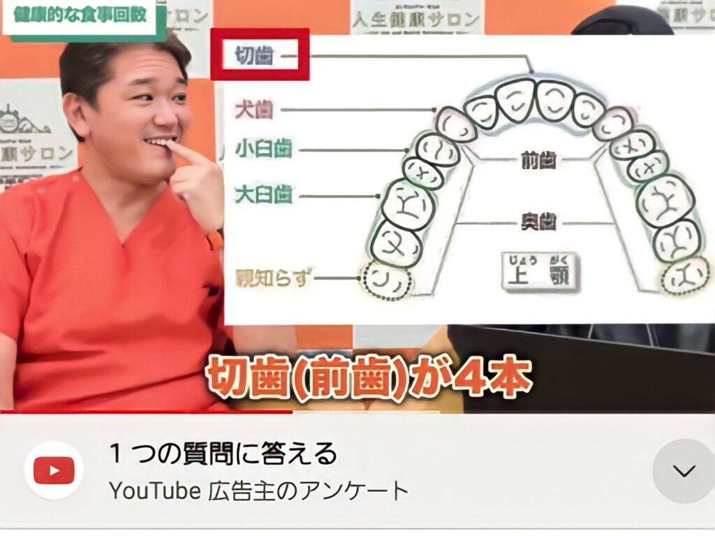 切歯(前歯)が4本、これは切断する歯です。犬歯が食い千切る歯です。