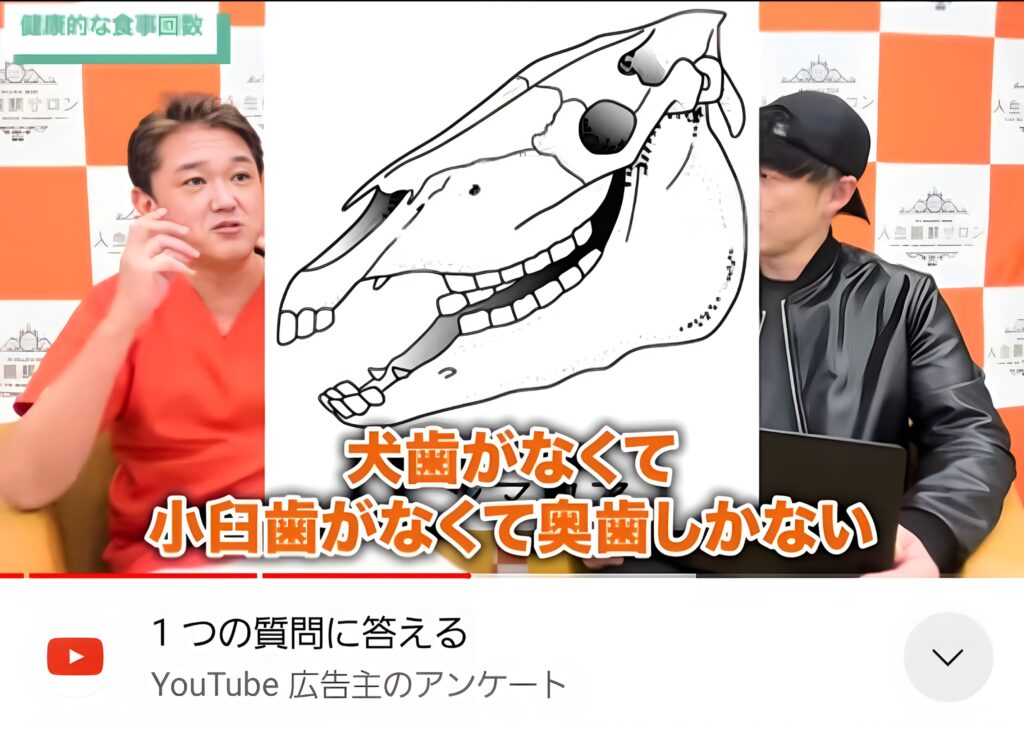 犬歯がなくて小臼歯なくて奥歯しかない。それを考えると人間は肉食と草食が1:1の比率なのです。